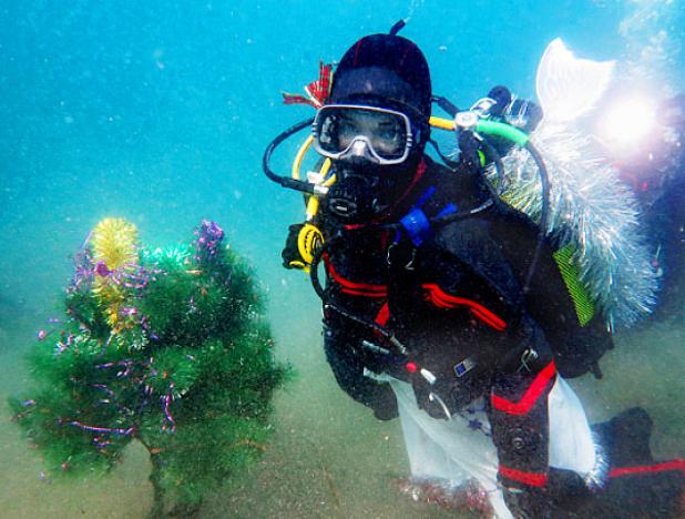 Спасатели Магаданского филиала Дальневосточного регионального поисково-спасательного отряда МЧС во 30 декабря спустились на дно Охотского моря и поставили на дне бухты Нагаева новогоднюю ель. В МЧС уточнили, что необыкновенная акция прошла в честь наступающего праздничка. При всем этом одному из спасателей поверх водолазного комбинезона надели костюмчик Деда Мороза. Праздничный процесс сняли на камеру.
